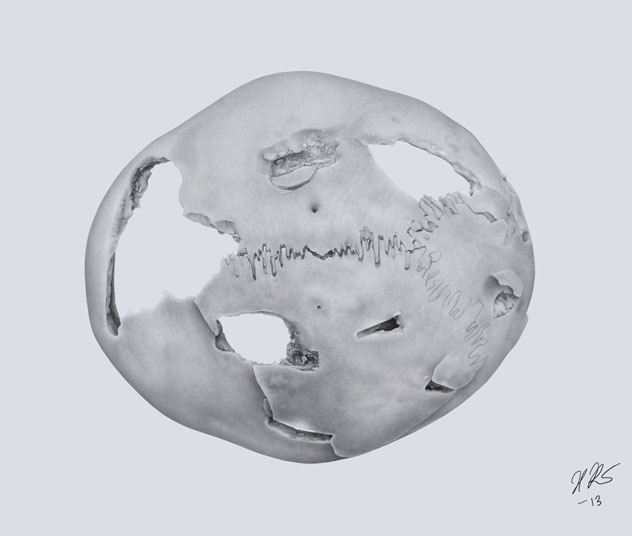 Anatomical illustrations This human skull (seen from above) was drawn from a museum specimen. It presents with trauma. The illustration was started with pencils and enhanced digitally in Photoshop.