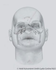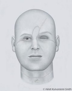 Facial illustrations of the patient before the surgery. Below illustrations of the patient’s damaged skull.